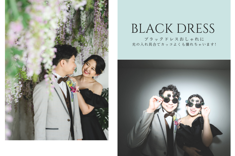 ブラックドレスと藤の花の相性もバッチリで素敵です˒˒