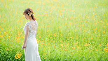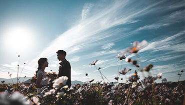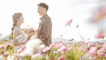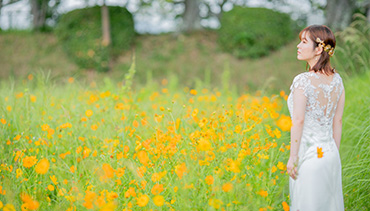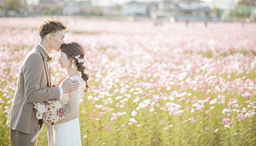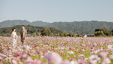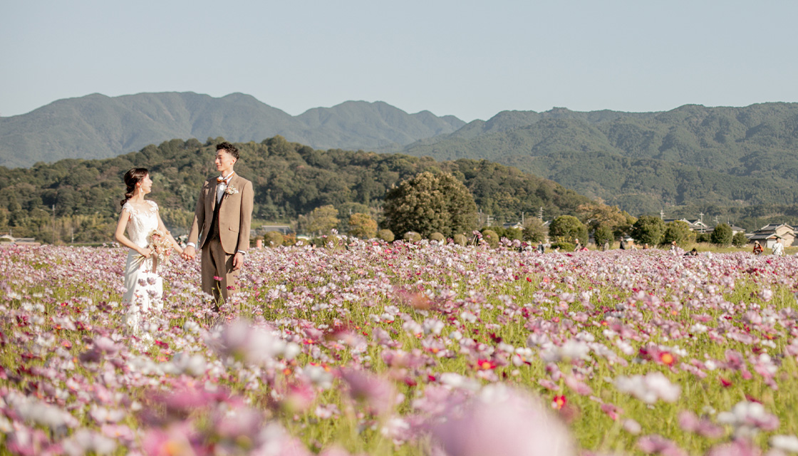 広大なスケールで咲くコスモス畑を背景に撮影できる、絶景ロケーションです。