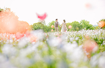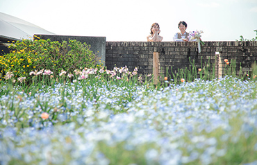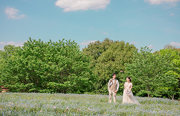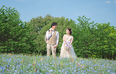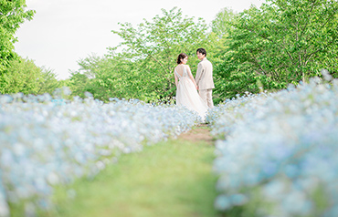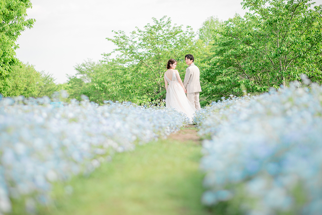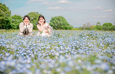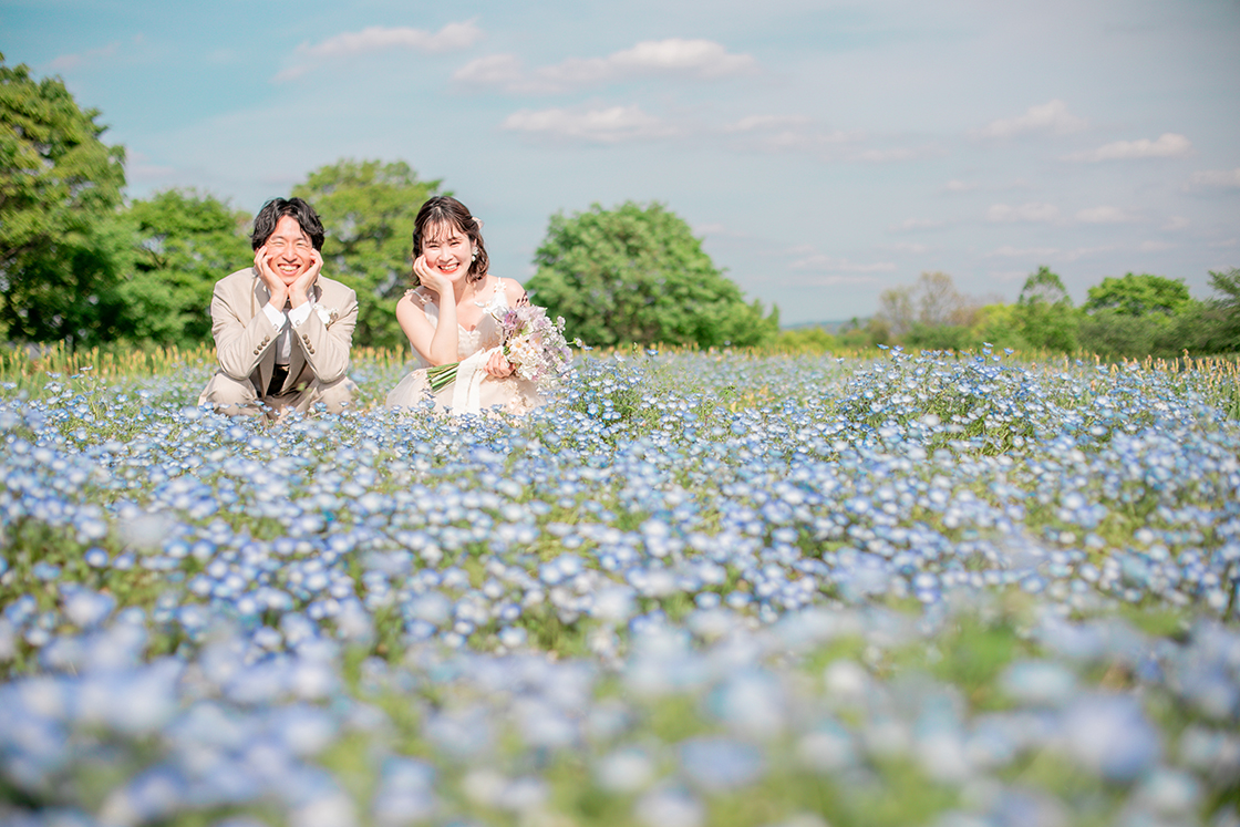 馬見丘陵公園の一面に広がるネモフィラ畑の中で、上品で華やかな撮影をお楽しみいただけます。
