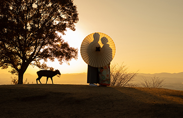 若草山山頂から望む、生駒山へ沈みゆく夕日は、約1300前の古代の人々が眺めた風景と同じともいわれています。